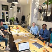 Deelnemers aan de Hackaton achter laptops aan een grote tafel en verderop in overleg aan bureau's